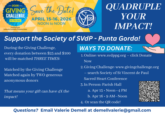 For 24 hours on April 15th, every dollar you donate to the Society of Saint Vincent de Paul, Sacred Heart Conference will have FOUR TIMES the impact.